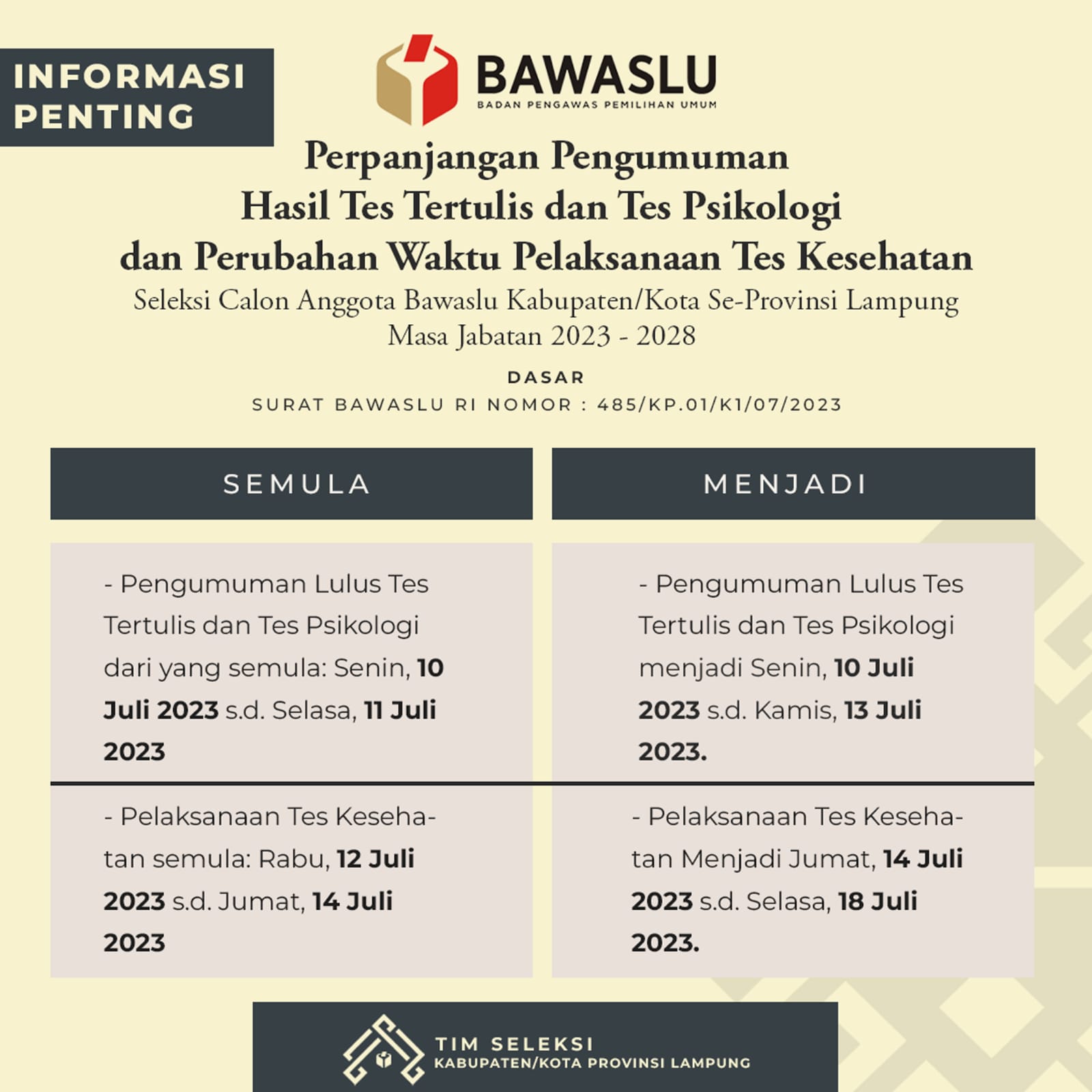 Kabupaten/Kota baik yang mengikuti tes tertulis dan tes psikologi di seluruh Kabupaten/Kota se- Indonesia, maka Bawaslu RI melakukan perpanjangan waktu Pengumuman Lulus Tes Tertulis dan Tes Psikologi dari yang semula: Senin, 10 Juli 2023 s.d. Selasa, 11 Juli 2023 menjadi: Senin, 10 Juli 2023 s.d. Kamis, 13 Juli 2023.