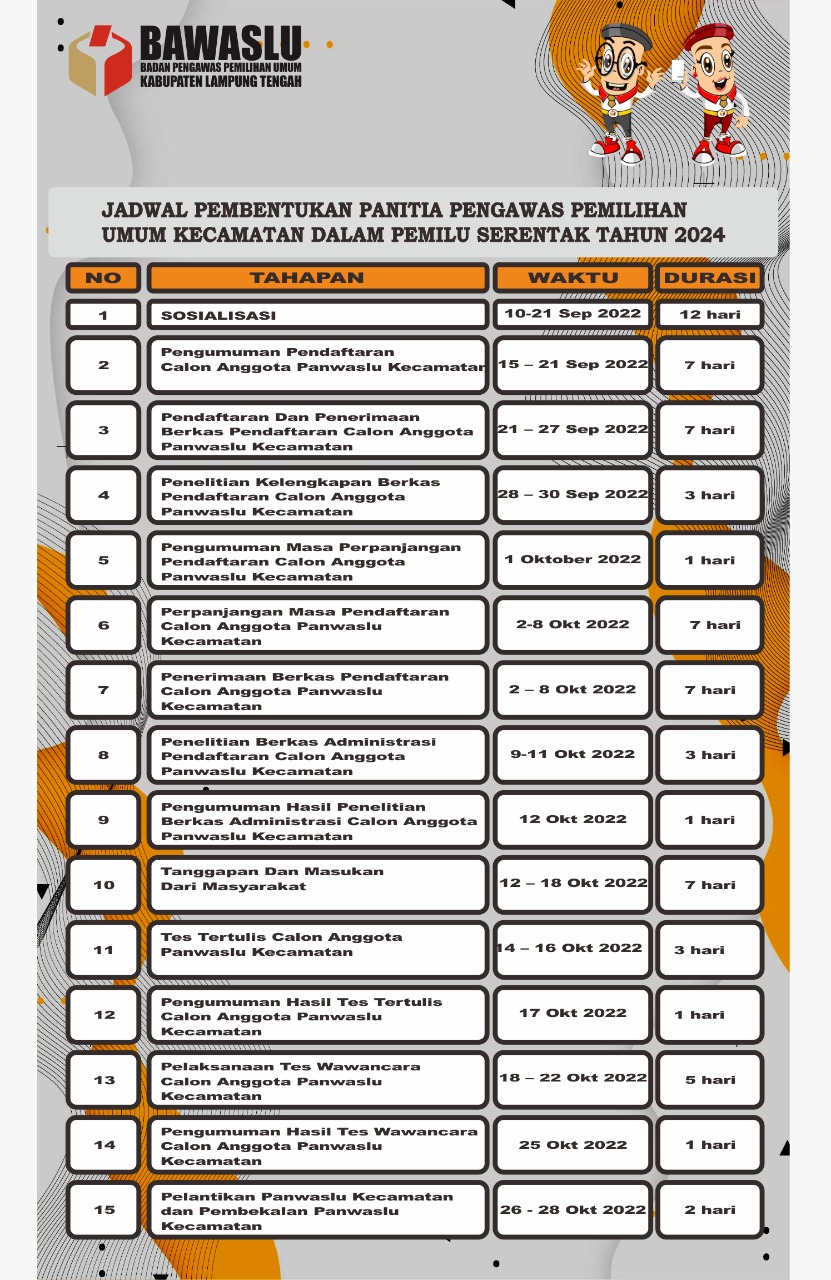 JADWAL PEMBENTUKAN PANITIA PENGAWAS PEMILIHAN UMUM KECAMATAN TAHUN 2024 humas | Selasa, September 13, 2022 - 03:49 Tag Pengumuman Share Berita Terkini humas Senin, Januari 12, 2026 - 10:16 BULAN K3 NASIONAL 2026, BAWASLU LAMPUNG TENGAH DUKUNG PENGUATAN EKOSISTEM K3 YANG PROFESIONAL DAN KOLABORATIF humas Minggu, Januari 11, 2026 - 09:49 TAHUN 2026 SEBAGAI MASA PENGUATAN INTEGRITAS, BAWASLU LAMPUNG TENGAH TEGASKAN KOMITMEN MENJAGA DEMOKRASI humas Sabtu, Januari 10, 2026 - 08:02 MOMENTUM HARI LINGKUNGAN HIDUP NASIONAL 2025, BAWASLU LAMPUNG TENGAH DORONG KESADARAN KOLEKTIF JAGA KELESTARIAN ALAM Lihat Lainnya